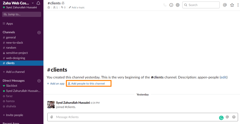 - Click the “Add people to this Channel” or “Add people to this Private Channel” link, depending on what type of channel it is that you have created