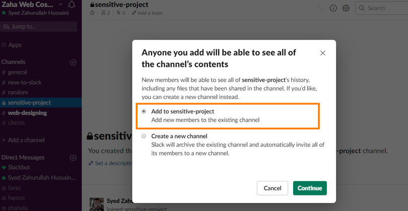 - If it is a Private Channel, then Slack will display a warning that the new member will be able to access the complete chat history of that private channel.